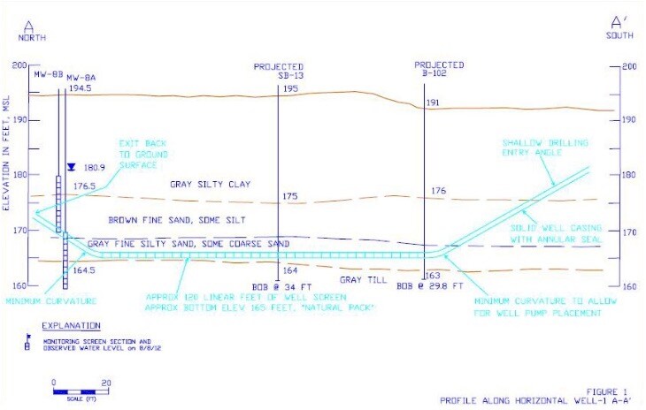 Various VOCs at a landfill site required treatment; however, disturbing the landfill cap was a major concern. Groundwater impacts were along a thin layer of gray fine silty sand directly above bedrock. Horizontal wells would allow a remediation system to be installed in the target zone without disturbing the landfill itself and also provide a greater capacity to recover groundwater in the narrow target zone. Two horizontal extraction wells were installed using precise tracking techniques to ensure that the wells would produce the highest yield.