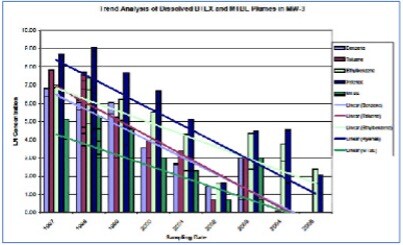 A 50,000-gallon release at a bulk fuel storage terminal had been under remediation for over a decade using traditional techniques. The consultant had successfully remediated large portions of the plume, but contamination of several acres in size still persisted in the vicinity of sensitive receptors. Engineering analysis revealed that a total of 129 vertical wells coupled with 23 blowers would be required to remediate the entire affected area via bio-sparge technology. The analysis further revealed that only 12 horizontal biosparge wells coupled with six blowers would be required to remediate the same area. These biosparge wells successfully achieved mass removal goals as well as controlled contaminant migration.