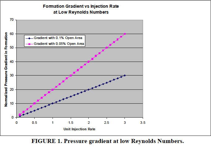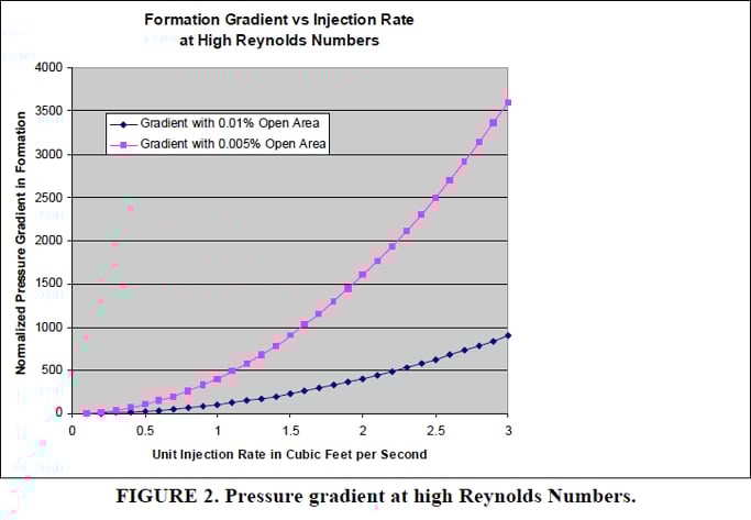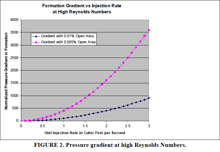 Figure 1 represents flow at low Reynolds Number values. Flow under these conditions is considered to be laminar. Liquid injection can be designed to maintain laminar flow through the well screen, preventing encrustation of the well. By contrast, soil vapor extraction wells commonly develop turbulent flow conditions. The two plots in Figure 2 represent the increase in pressure gradient in response to increasing flow rates under flow conditions with relatively high Reynolds Number values. The plots show a non-linear increase of the normalized pressure gradient with increasing flow rate. Under these flow conditions, the pressure gradient increases by several orders of magnitude while the flow rate increases by integer amounts. The two plots in Figure 2 represent screen open areas that differ by a factor of two, and illustrate the increased sensitivity of flow rate to the pressure gradient with decreasing open area of the well screen.