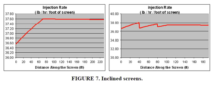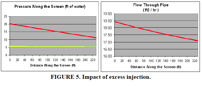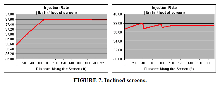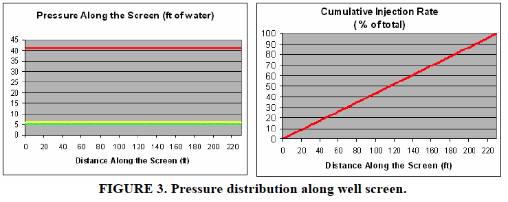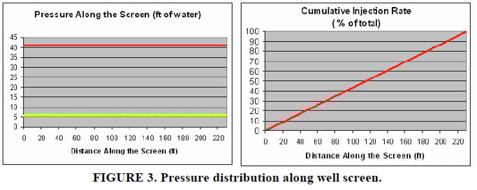 The lower plot represents background pressure in the formation. Excessive pressure drop can lead to a declining injection rate along the well screen, as shown on the right hand side of Figure 6. The same engineering principles apply to the design of extraction well