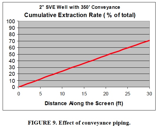 Finally, the importance of taking into account the length or diameter of conveyance piping between the blower or fluid source and the wellhead is illustrated by the Figure 9, which shows the cumulative extraction rate for a soil vapor extraction well which was