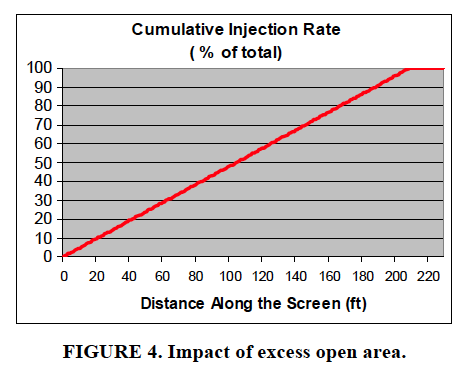 Small changes in open area can be detrimental to the effectiveness of the well. Figure 4 shows the impact along the well screen of a ten percent increase in open area over the optimal amount. The cumulative injection rate reaches 100 percent about 20 feet before the end of the well screen. This means that 20 percent of the screen is ineffective.