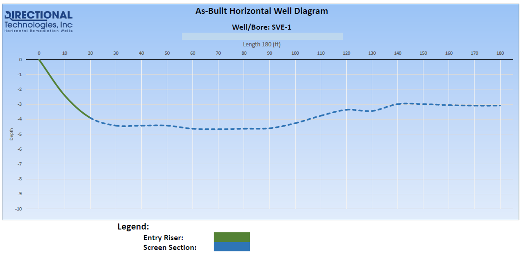 Directional Technologies teamed up with the consultant to help design and implement a horizontal remediation system that would meet the remedial goals of the project. The primary objective of the horizontal system was to overcome the obstacle of the existing on-site facility and fuel dispensers while providing optimal access to the source area soil contamination to mitigate vapor intrusion. DTI installed four horizontal SVE wells to address the contamination at the site. As shown in Figure 1, horizontal wells SVE-1 through SVE-3 were constructed of 3” PVC and extended to a length of 180’, with 160’ of screen. SVE-1 bounded the north end of the plume, while SVE-3 was installed to act as a barrier along the entrance of the gas station facility, preventing the threat of vapor intrusion into the store. SVE-2 was installed to address the core of the plume closest to the fuel dispenser canopy. The groundwater flow direction was generally to the southeast, threatening the off-site migration of the contaminant plume. To combat this, SVE-4 was installed in the vadose zone perpendicular to groundwater flow along the southeast edge of the property, totaling 130’ in length with 100’ of screen. The purpose of this design was to surround the soil contamination plume while simultaneously targeting the source area and providing a protective barrier to the building.