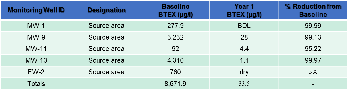The horizontal AS/SVE system operated from October 2012 through October 2014. The air sparge components of the system were restarted in April 2015 and operated through 2016. Analytical data from subsequent groundwater sampling indicated significant reductions of total BTEX concentrations from baseline.