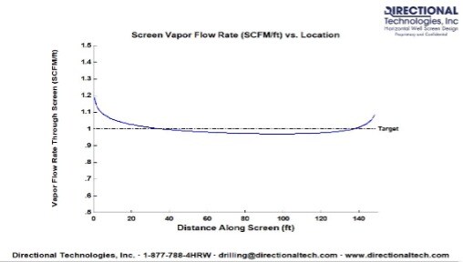 Due to the unexpected increase in contaminant concentrations, Directional Technologies was asked to return to the site in 2022 and install two more horizontal SVE wells to assist in source area soil contamination reduction. The horizontal SVE wells were installed to lengths of 260 feet (ft) and 300 feet beneath the building, also implementing blind installation technologies. As a result, the installation process eliminated interferences with any on-site activities relating to business operations while still providing maximum screen contact with the source of the soil contamination. Directional Technologies provided their professional support in the operation of the horizontal remediation system to maximize the performance of each SVE well and reduce soil contamination levels. Figure 2 illustrates how Directional Technologies implemented their proprietary screen design software to precisely acquire the target flow rates for each horizontal SVE well.