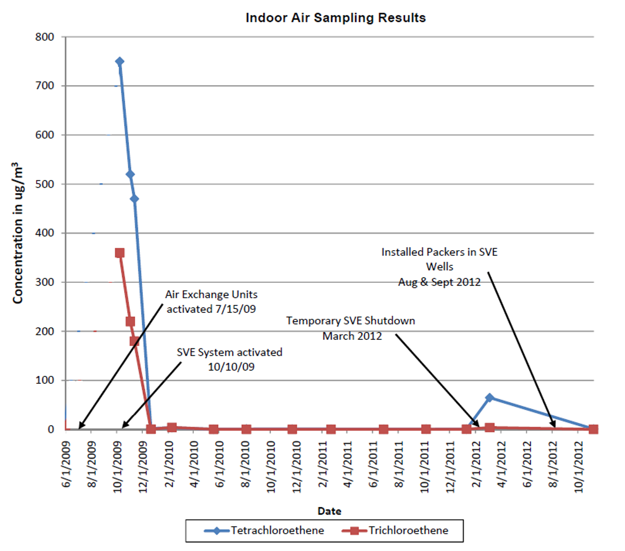 Pilot testing results indicated that each well achieved an approximately 21-foot radius of influence. The average total flow rate for the SVE system was approximately 133 CFM. The initial operation of the system resulted in a sharp decline in indoor air concentrations of PCE and TCE.