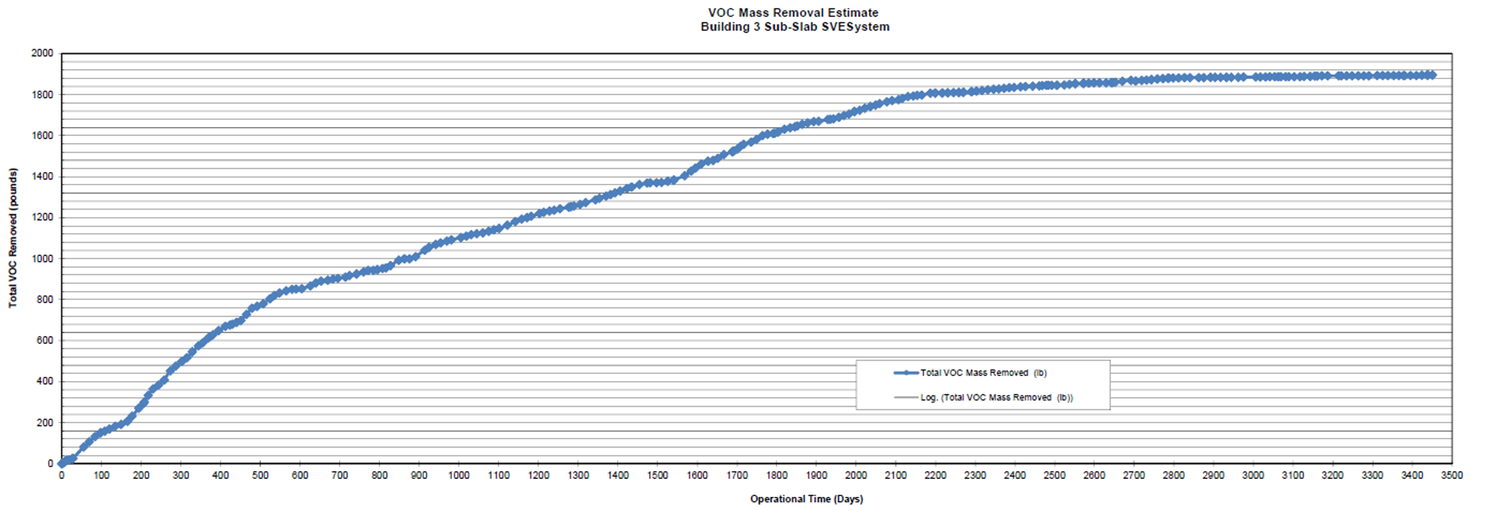 Over an 11-year period, the SVE system had removed an estimated 1,915 pounds of VOCs from beneath the building, with daily removal rates as high as 3 pounds per day in the first year of operation. As VOC concentrations reduced over the years, the system was operated as a mitigation system with an applied vacuum at all four SVE wells.
