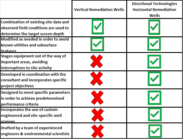 As many experienced environmental consultants have discovered, drilling plans are an easily overlooked but vitally important component in the success of a newly installed remediation system. Drilling plans can include drilling method selection, drilling tooling selection, pipe size selection, well screen target depth identification, safety procedures, equipment staging locations, well layout, investigation derived waste management, site-specific protocol, QA/QC, and much more. Traditional vertical remediation well installations and Directional Technologies’ horizontal remediation well installations adopt different approaches to developing and implementing drilling plans. The consequences of those differences can affect the level of success of your remediation project. See the chart below to find out just how much drilling plans can differ between different types of remediation system installation technologies.